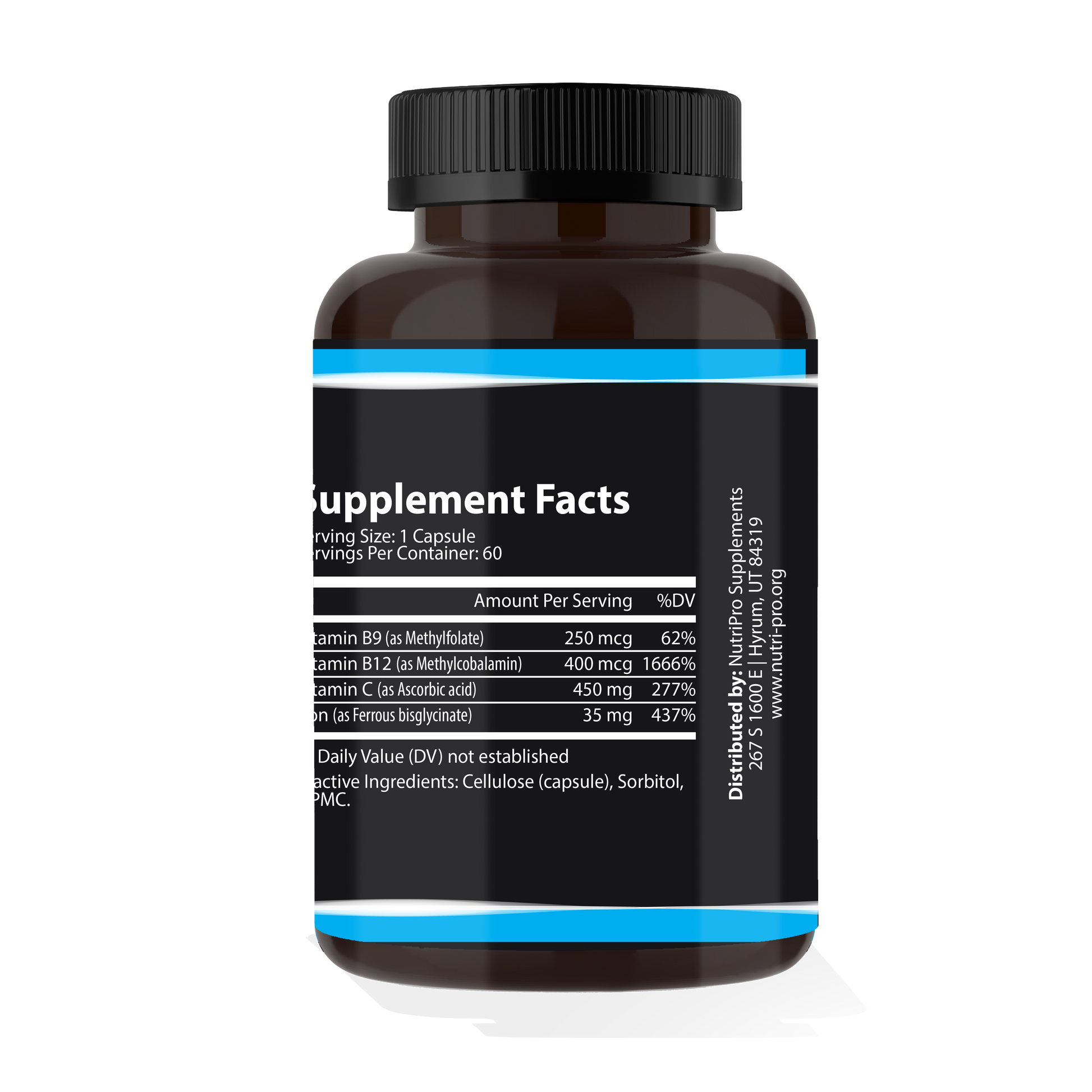 Revitalize your health with our Anemia Support Supplement, specially formulated to combat fatigue and promote optimal wellness. Delivering a potent blend of key nutrients, including Iron, Vitamin B9 (Methylfolate), Vitamin B12 (Mehtylcobalamin), and Vitamin C, designed to enhance iron absorption and support red blood cell production.
